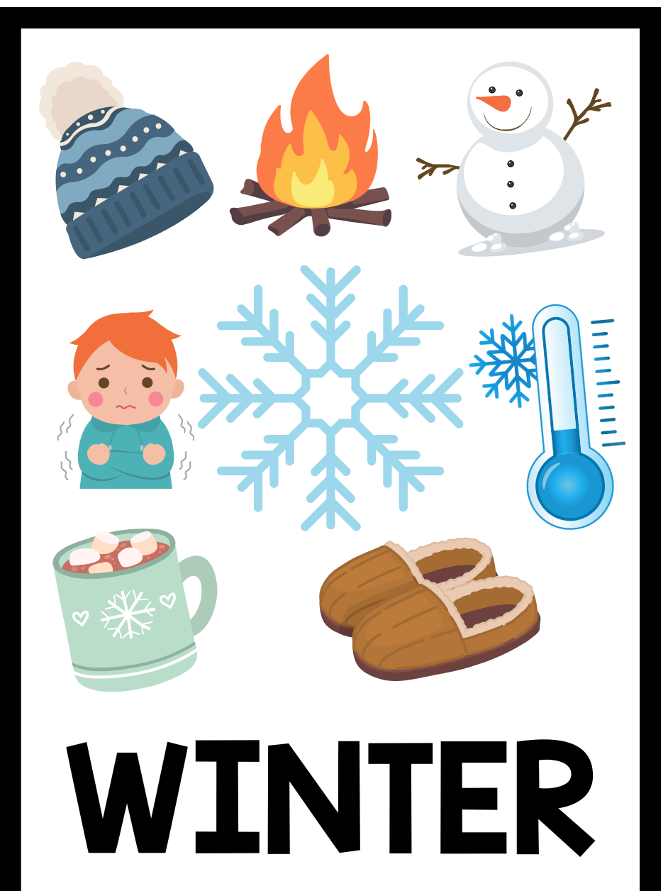 Winter is the coldest season. Sometimes it snows, and we wear coats, mittens, and hats. Trees lose their leaves, and some animals hibernate or sleep through the season.