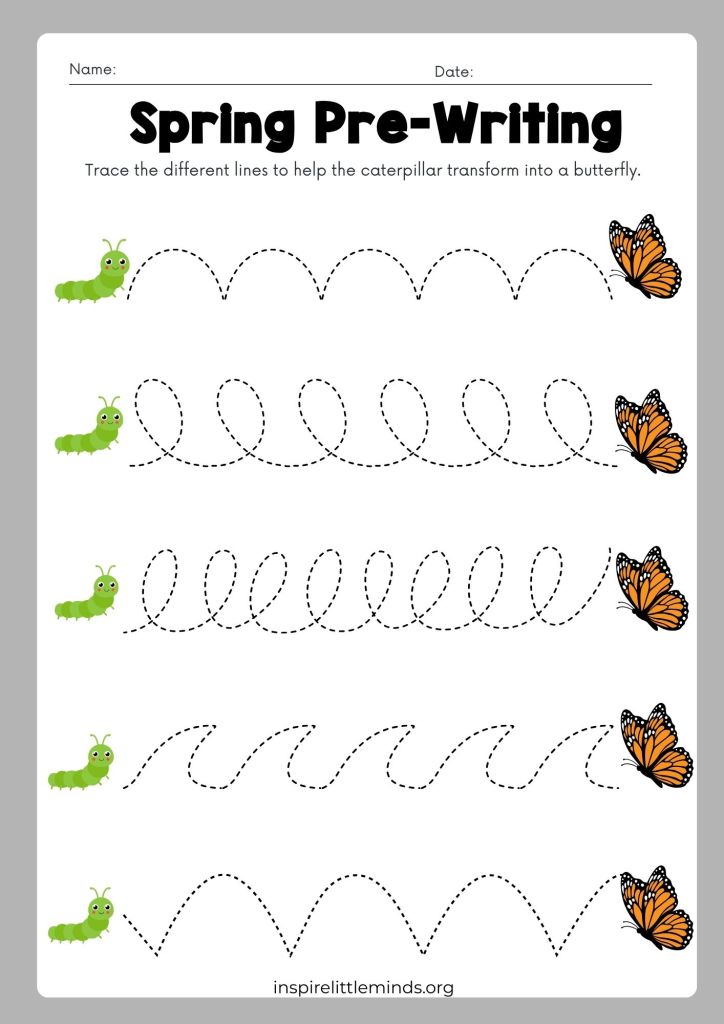 - Worksheet 2: More advanced tracing lines. Trace the lines to help the caterpillar transform into a butterfly.