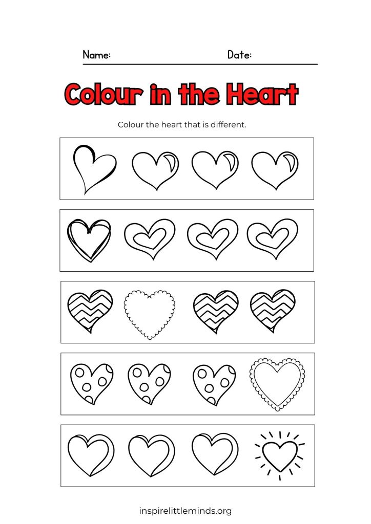 Ask your preschooler to look closely and find the heart that looks different. Encourage them to circle or colour it.